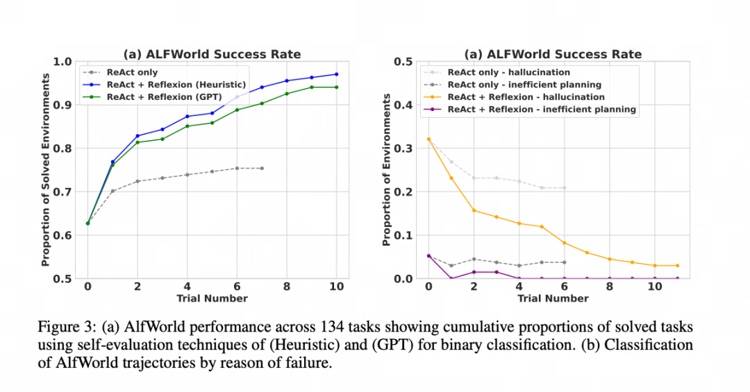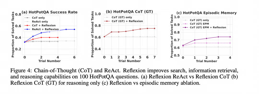 实验结果表明,Reflexion 在多种任务上都取得了显著的性能提升,与 ReAct 和其他方法相比: