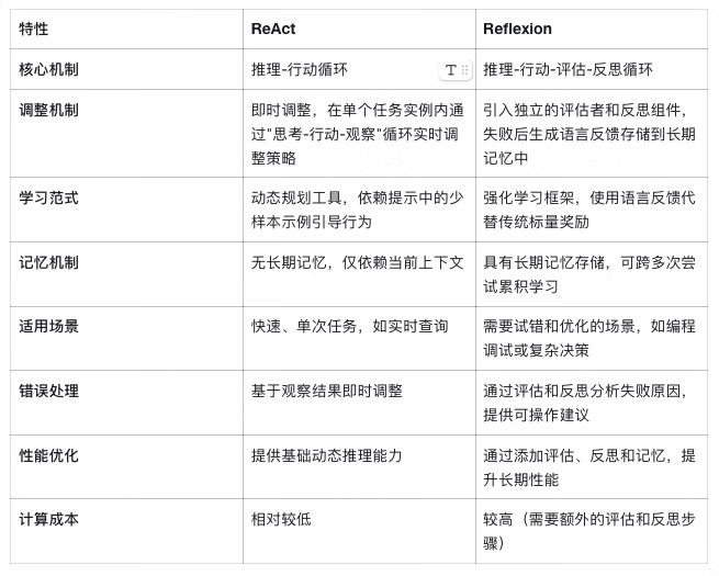 虽然 ReAct 和 Reflexion 在示例中看起来相似(如两者都涉及思考-行动循环),但它们在机制和应用上存在关键差异: