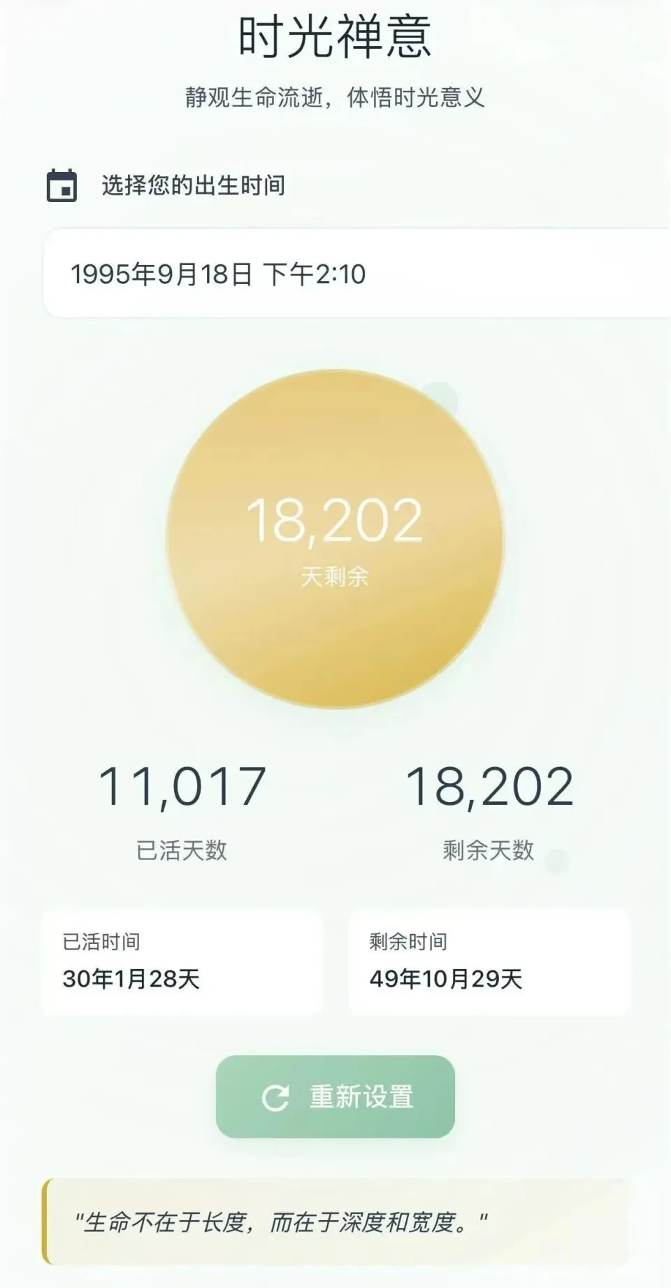 帮我做一个非常好看的人生计时器,禅意的背景,可以设置出生时间,来看看我的生命还剩下多久,要有一些哲学意味