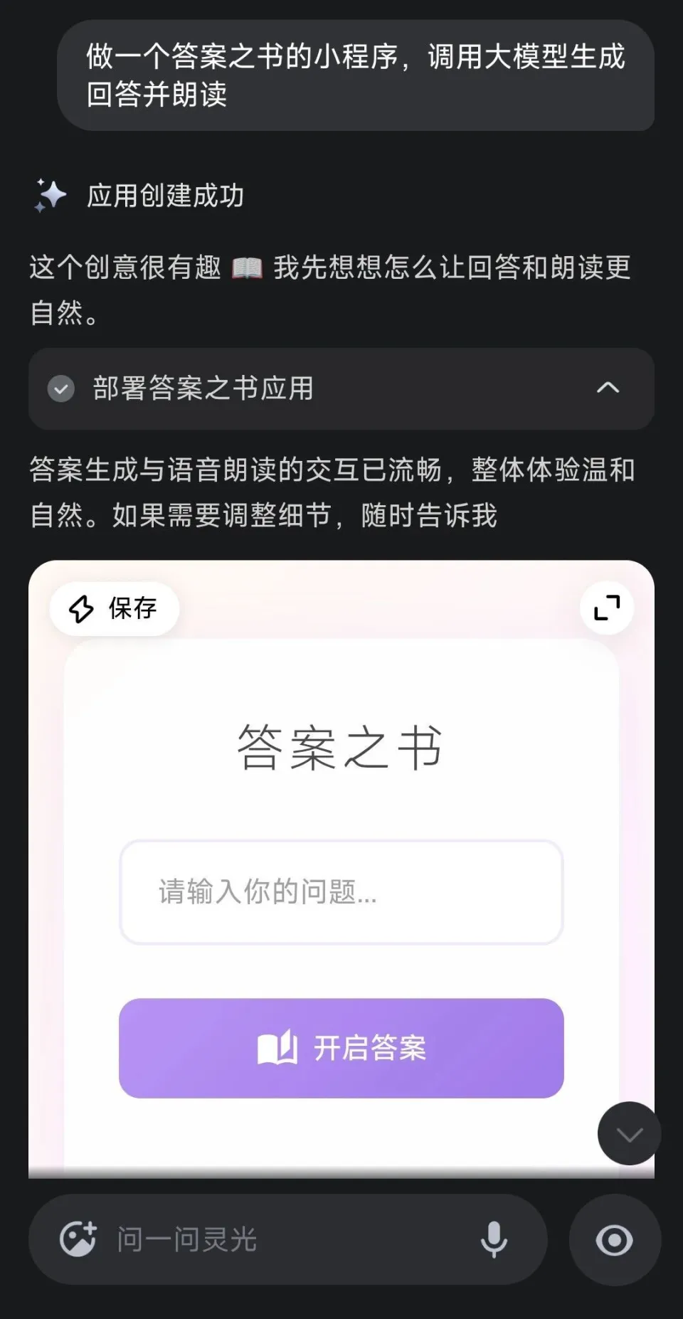 比如,我说,做一个答案之书的小程序,调用大模型生成回答并朗读。