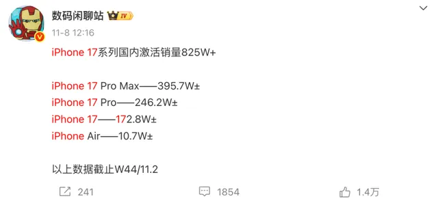 不过,整体来看,苹果抖音官旗的销量并不算多,据数码博主“数码闲聊站”透露,截至11月2日,iPhone 17系列在中国累计激活销量已超过825万台。
