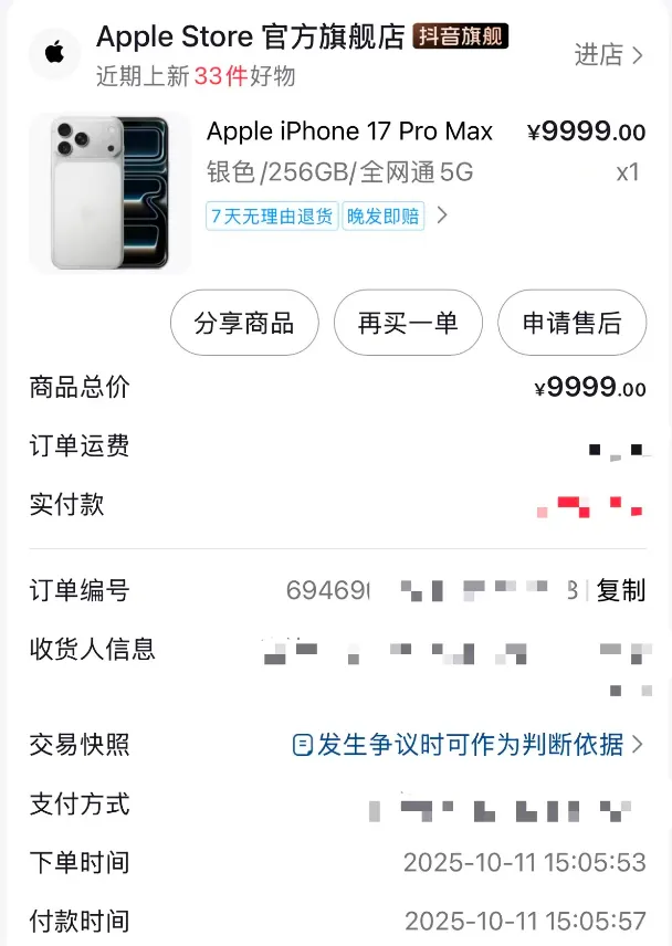 在长沙工作的白领陈慕,就是冲着正品和售后保障,才在苹果抖音官旗以9999元的原价购入了iPhone17 Pro Max,尽管相比其他平台没有优惠,但是陈慕很安心。