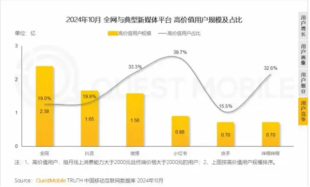 尽管抖音月活超10亿,但是却困囿于高价值用户(即月线上消费能力及终端价格均大于2000元)。QuestMobile数据显示,截至2024年10月,抖音的高价值用户比为19.9%,略高于全网19%的占比,但是低于小红书、B站、微博的40%、33%、33.3%。