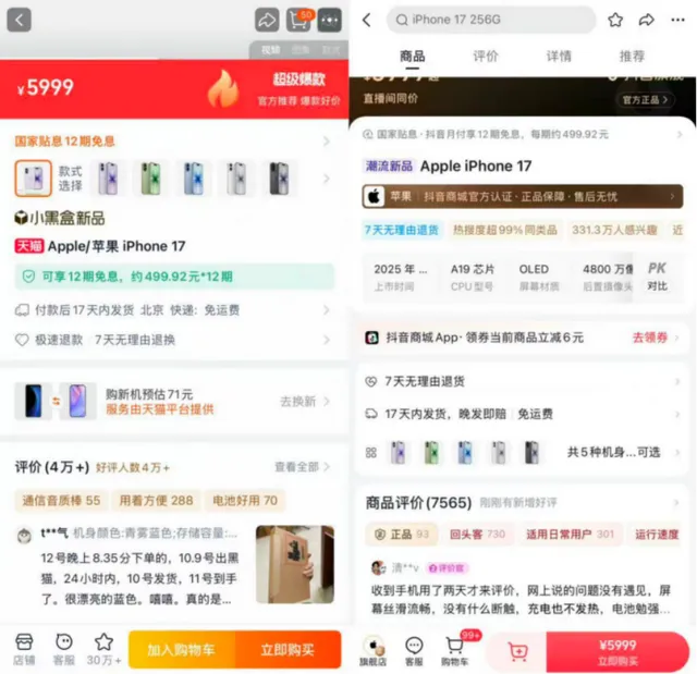 仅从用户评论数来看,iPhone 17系列在天猫官旗的评论数已超12万条,而抖音官旗为2万余条。久谦中台研究数据也显示,在iPhone17系列的电商平台首发预售7天内,苹果天猫官旗销量占65%,京东自营店占17%,苹果抖音官旗占15%。