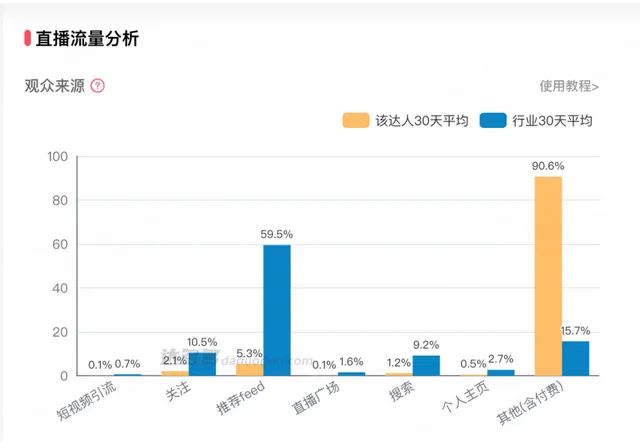 多个第三方平台数据显示,苹果官旗直播间的付费流量占比较大。譬如9月19日的首次直播,付费等流量占比为94%;近一个月以来,直播间付费等流量占比约为90%,来自抖音的推流不到6%。