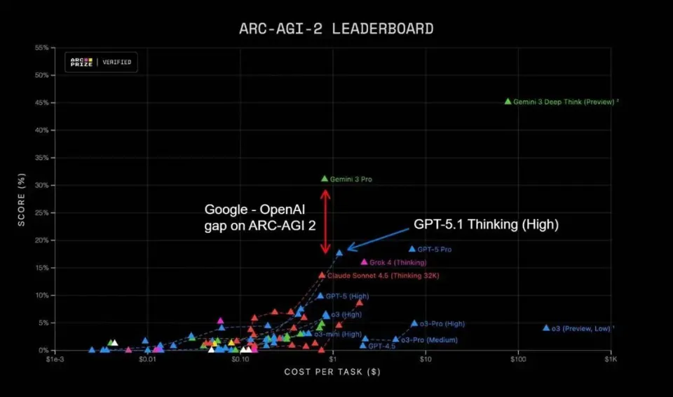 在行业主流的20个基准测试中,Gemini 3 Pro在其中的19个项目上获得了最高分,超越了Gemini 2.5 Pro、Claude Sonnet 4.5和GPT-5.1。尤其是在ARC-AGI-2上,Gemini 3和Gemini 3 Deep Think,更是将成本与精度的帕累托前沿,向有利方向推得更远了一些。该测试基准旨在衡量模型对从未见过的任务的推理能力,难以死记硬背。