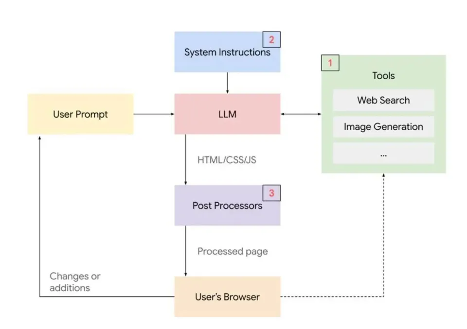 同样的逻辑也延伸至AI原生的搜索体验。这次,谷歌提出Generative UI,让搜索不再只是“回答问题”,呈现链接、文本或已有的视频,而是实时动态地生成一个为用户搜索量身定制的可视化或者可交互的界面。这涉及到大量的工具调用(Tool Access)与后处理(Post-processing)。