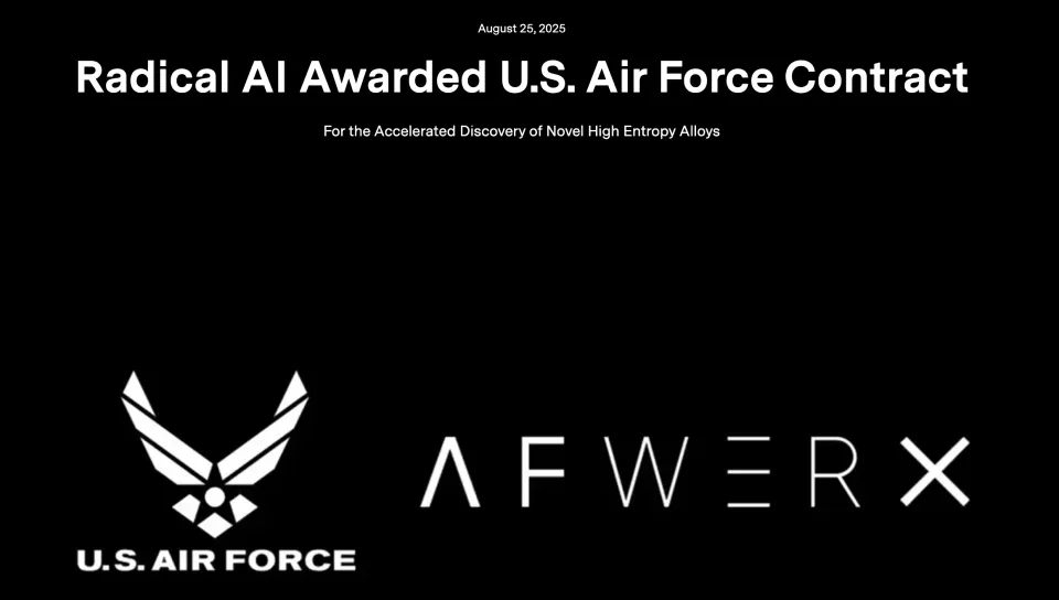 2025 年 8 月,Radical AI 获得了美国空军(DAF)下属 AFWERX 的一份 D2P2(Direct-to-Phase II)合同,合同金额约为 120 万美元。该合同目的是为了应对高超音速飞行条件下的极端环境,Radical AI 将协助开发新型高熵合金(HEAs),以提升材料的热机械性能,满足美国空军对先进合金的需求。
