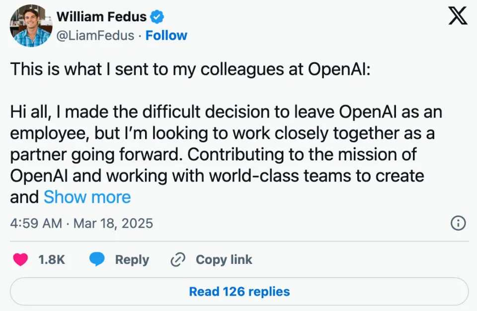 作为 ChatGPT 的共同创建者(co‑creator),他最初在专注于数据和评估的 RL 团队工作,之后领导了 post training 研究团队,他在将 OpenAI 研究成果转化为可实际使用的 ChatGPT 产品方面发挥了重要作用。在担任 OpenAI post training 团队的 VP of Research 期间,他负责领导团队监督 AI 模型在初始训练后的优化这一关键环节,从而使模型成为安全、一致、可全球部署的产品。
