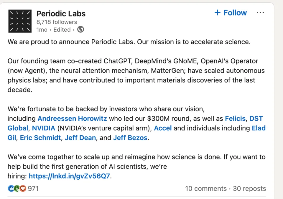 2025 年 9 月,Periodic Labs 完成了 3 亿美元的种子轮融资,本轮由 Andreessen Horowitz(a16z)领投,其他投资者包括 Felicis、DST Global、NVIDIA、 Accel 和一些个人投资者。根据公开报道,在完成融资前,Periodic Labs 的估值达到了 10 亿美元,也有新闻表示最高达到了 15 亿美元,这笔交易是近期 scientific AI 领域规模最大的投资之一。
