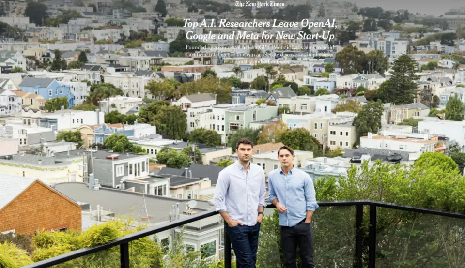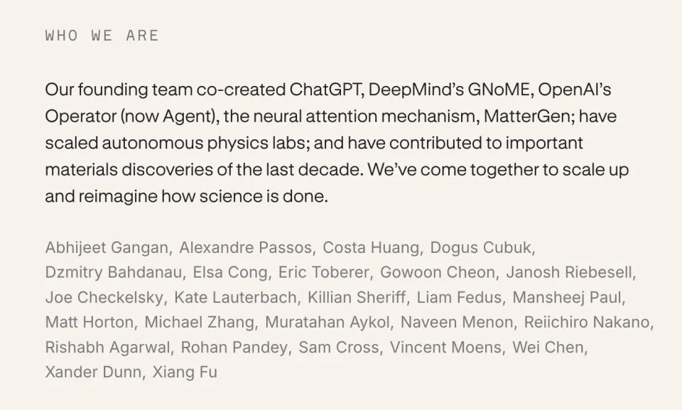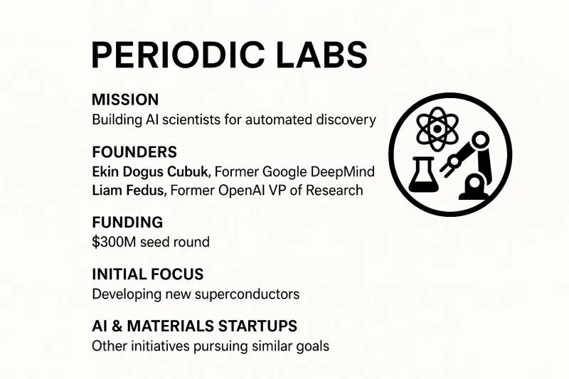 Periodic Labs 由 ChatGPT co‑creator Liam Fedus 和 DeepMind 材料科学负责人 Ekin Dogus Cubuk 创立,目标是打造能自主设计并执行现实实验的 “AI 物理学家”。团队从高温超导和磁性材料切入,希望为未来的科学超级智能(scientific superintelligence)奠定基础。