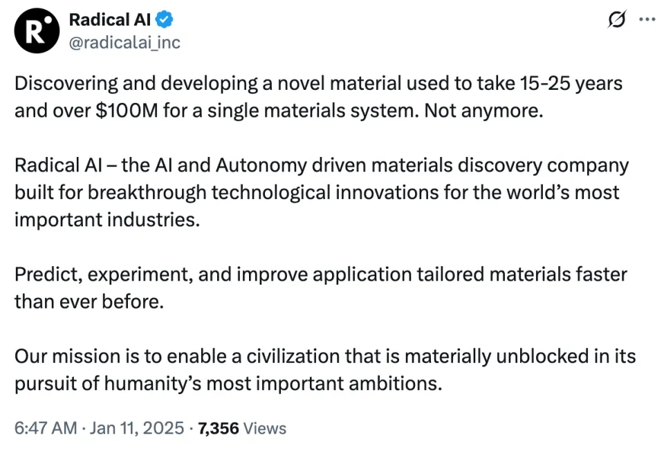 Radical AI 成立于 2025 年初,希望能通过将 AI、工程学、物理理论与应用研究相结合,重塑材料的设计、开发与发现流程。今年 7 月,公司完成了由 RTX Ventures、NVIDIA 等投资方参与的 5500 万美元种子轮融资。