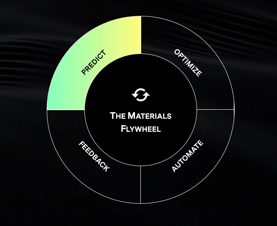 公司构建了一个由 AI 驱动的材料研发闭环系统,用于加速材料的发现与开发。这个系统结合了高通量分子量子力学方法、由原子预测建模和生成方法组成的 AI 引擎以及具有自动化化学合成和表征功能的全自动驾驶实验室。整个“材料飞轮”由四个环节构成: