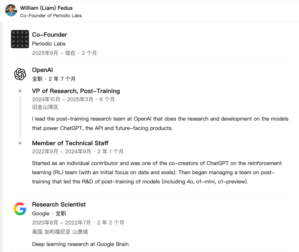 Periodic Labs 的创始人是 Liam Fedus 和 Ekin Dogus Cubuk。 两人在 Google Brain 相识并共事,之后分别加入 ChatGPT 和 DeepMind。