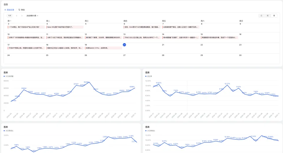 单看页面长啥样不够,给你们举一个例子,让你们能够更直观get到,系统相比传统的多维表格形态和仪表盘,到底意味着什么。