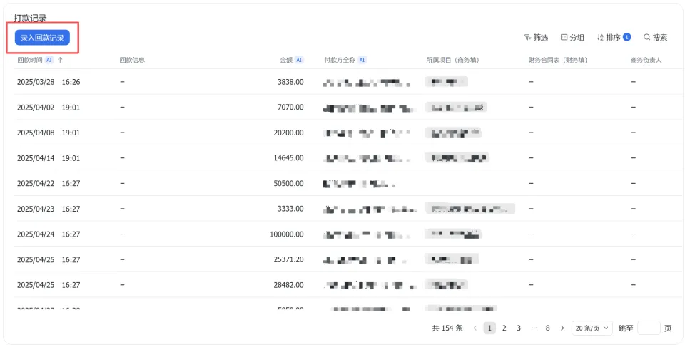 财务只要点击这个录入汇款记录的图标,把收到的回款短信粘贴上去,后面的AI字段就会自动摘出金额和付款方,然后录入到这个列表中。