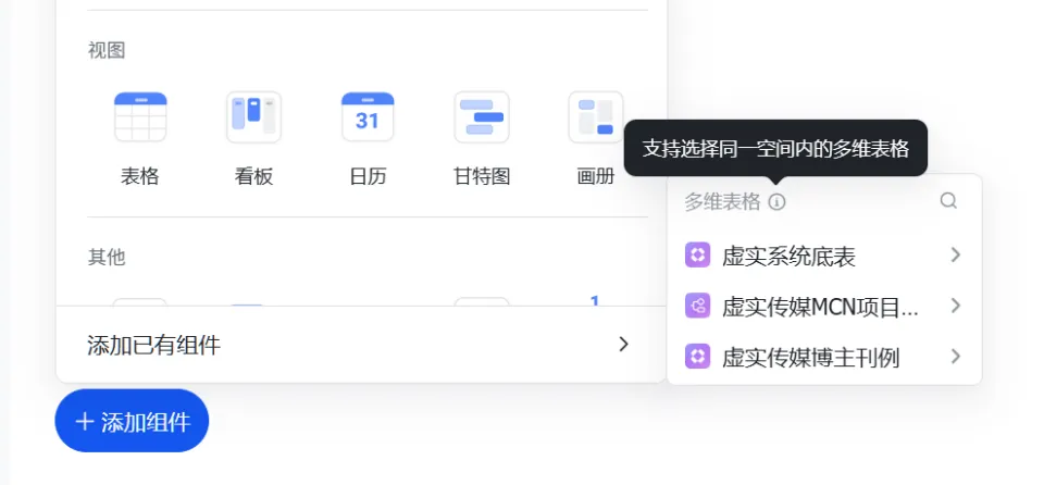 只要把不同的表格都放进同一个多维表格空间,就可以把这些表格里的已有内容,全都添加到同一个应用里,包括表格、仪表盘、各种看板。