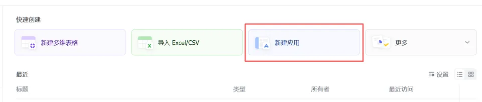 现在飞书多维表格应用模式已经全量开放了,进入飞书多维表格,然后点击新建应用,就可以开始创建你的多维表格应用了。