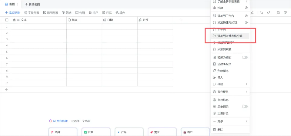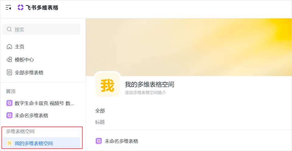 当你创建了一个新的多维表格空间之后,你就可以在创建一个新的多维表格的时候,把它添加到多维表格空间里。