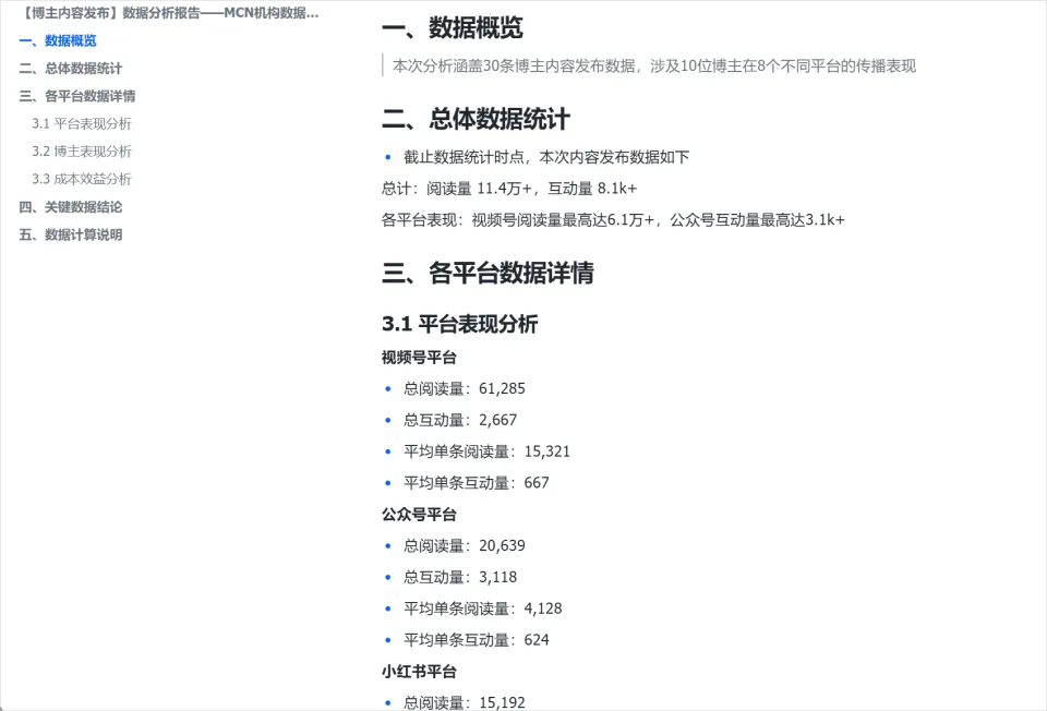 不同博主、不同平台的数据都汇总在一个文档里,省去了非常多我们自己填数据的时间。
