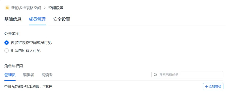 把需要的表格都放进这个多维表格空间之后,还可以开放不同的权限给不同的成员。