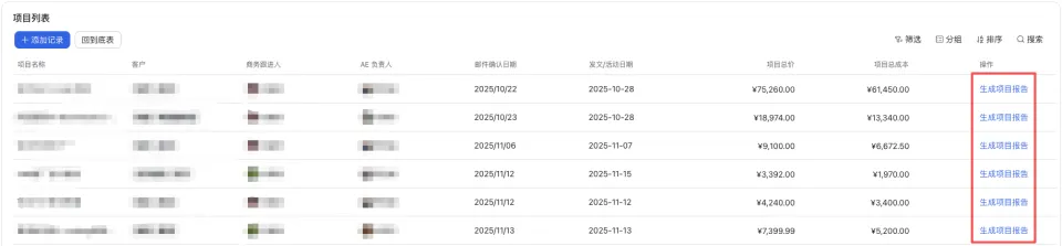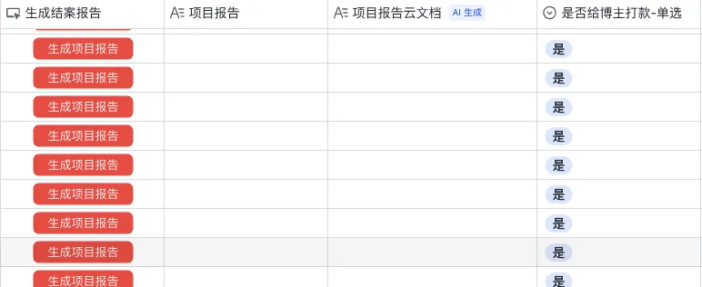后面虽然做了爬虫和AI自动提取数据,也在多维表格上加了一个生成项目报告的按钮,但在多维表格里,这个按钮字段在整个表格的第二十二列,而且所有的行都有,非常的丑和抽象。
