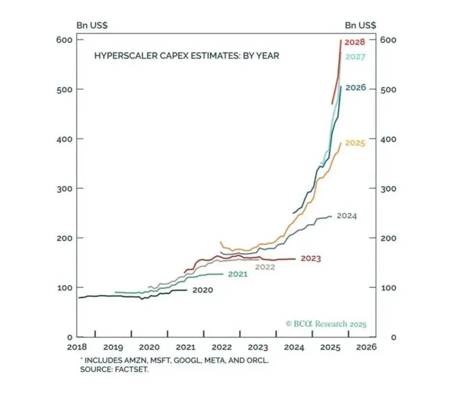 无论有多少资金循环,最终都要靠AI应用来兜底。AI应用创造价值,才能构成真正的“经常性年化收入”。但是,据花旗银行测算,今年整个AI行业的收入也就430亿美元。而据BCA research估算,到2030年,超大规模云服务商将持有2.5万亿美元的人工智能资产,对应当年5000亿美元折旧,比2025年利润总和还多。