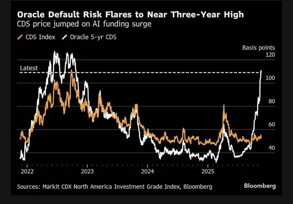 英伟达扶持了一批新云公司,甲骨文就是最大号的那家,其五年期CDS(信用违约互换)大幅飙升。公司违约风险越高,市场对它的风险定价也就越高。推动这波飙升的,并非整体信用环境的恶化,而是甲骨文本身的基本面正在恶化。它的自由现金流长期为负,却继续举债扩张,甚至涉及层层转包的私募债。巴克莱银行(Barclays)警告,甲骨文将在1年后耗尽现金。这很难不连累OpenAI与甲骨文将于2027年执行的4.5GW算力,当然也对应着英伟达的收入。