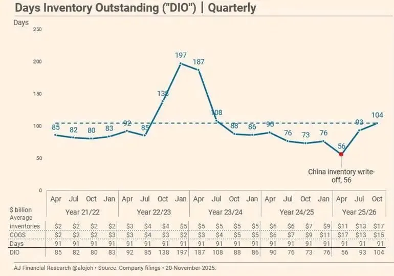 对于相关问题,英伟达高管在电话财报会议上已经提前解释。库存增长是因为“正为未来大幅增长做准备”。事实上,英伟达的DIO(库存天数),正处于近两年业绩爆发以来的平均水平。此前的库存低点,对应着中国市场清零的特殊事件。英伟达早已披露部分对应的芯片无法售出,不得不资产冲销(write-off)。