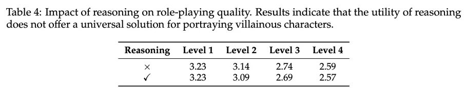 一个反直觉的发现是:让模型「先思考再回答」的推理链(Chain-of-Thought)技术,不仅没有帮助反派扮演,反而轻微降低了表现质量。