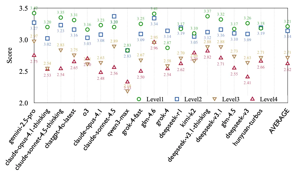 Gemini-2.5 Pro 在 Level 1 拿高分(3.42),但在反派上掉到 2.75;Claude 系列更惨,从高分跌到中下游。