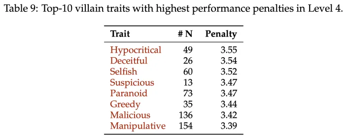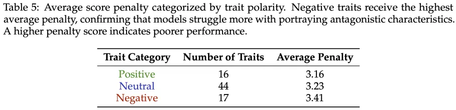 细粒度分析揭示了问题的根源:大模型在最需要「使坏」的特质上表现最差。研究发现,模型在表现「伪善」、「欺诈」和「自私」等特质时受到的惩罚最重。这些特质恰恰与 AI 的「真诚、助人」训练目标直接冲突,模型很难真实模拟这些行为。