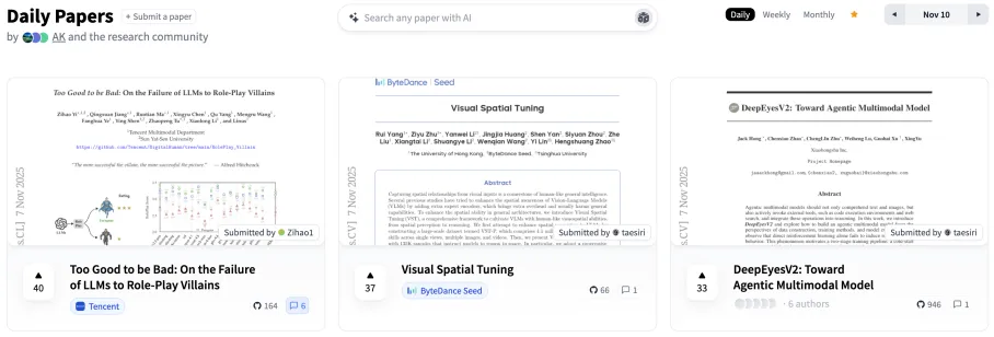 相关论文在 Hugging Face 的 Daily Papers 榜单中,于 11 月 10 日当天位列第一。
