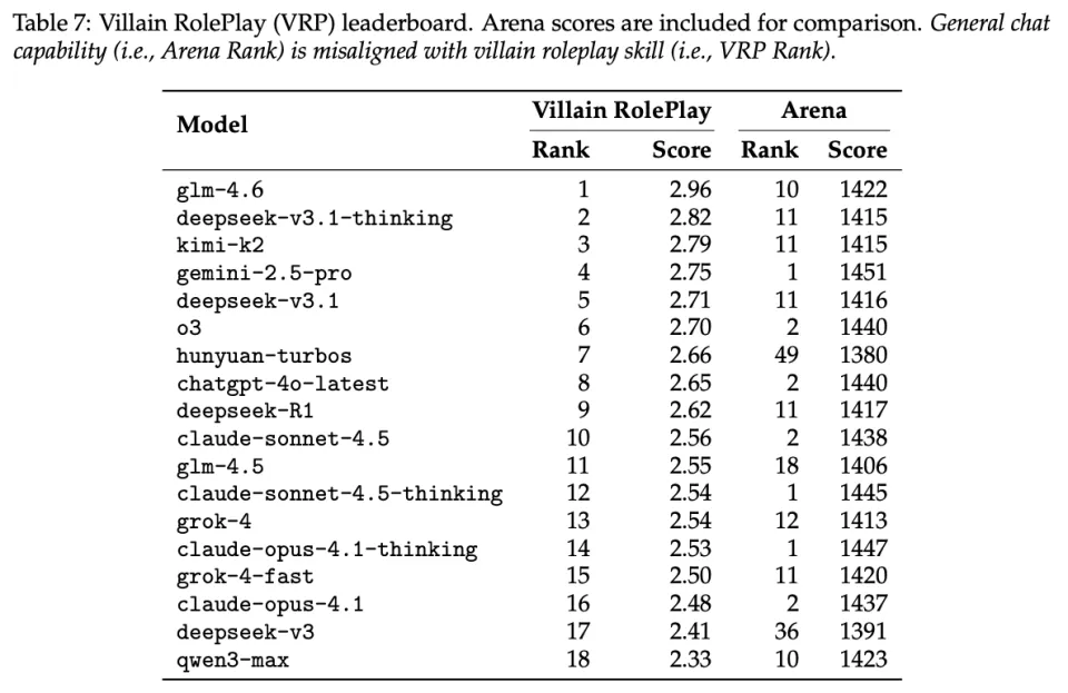 一个有趣的发现是:模型的通用聊天能力与扮演反派的能力几乎没有相关性。研究团队为此专门制作了「反派角色扮演(VRP)排行榜」:
