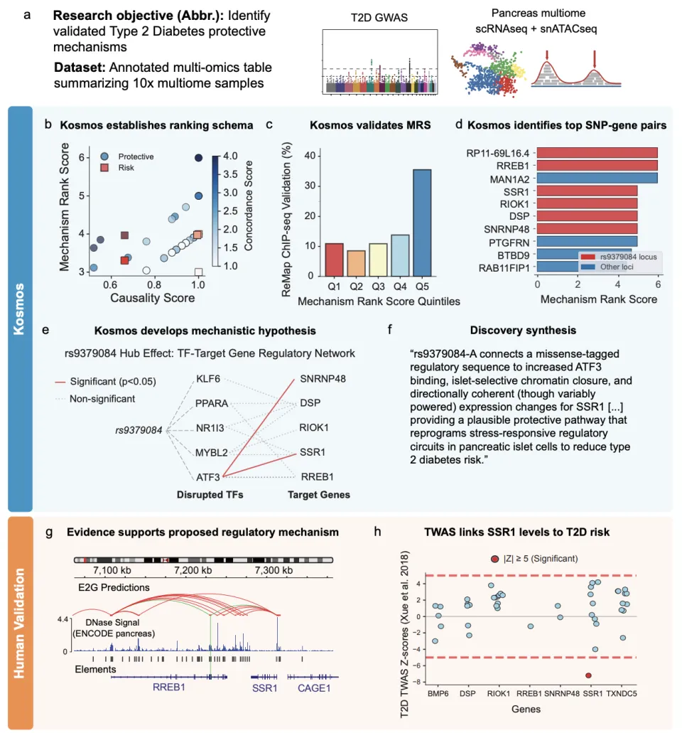 第五项发现:Kosmos基于多组学和统计遗传学公开数据,提出了一个全新的分子机制,解释某一单核苷酸多态性(SNP)如何可能降低2型糖尿病的患病风险。