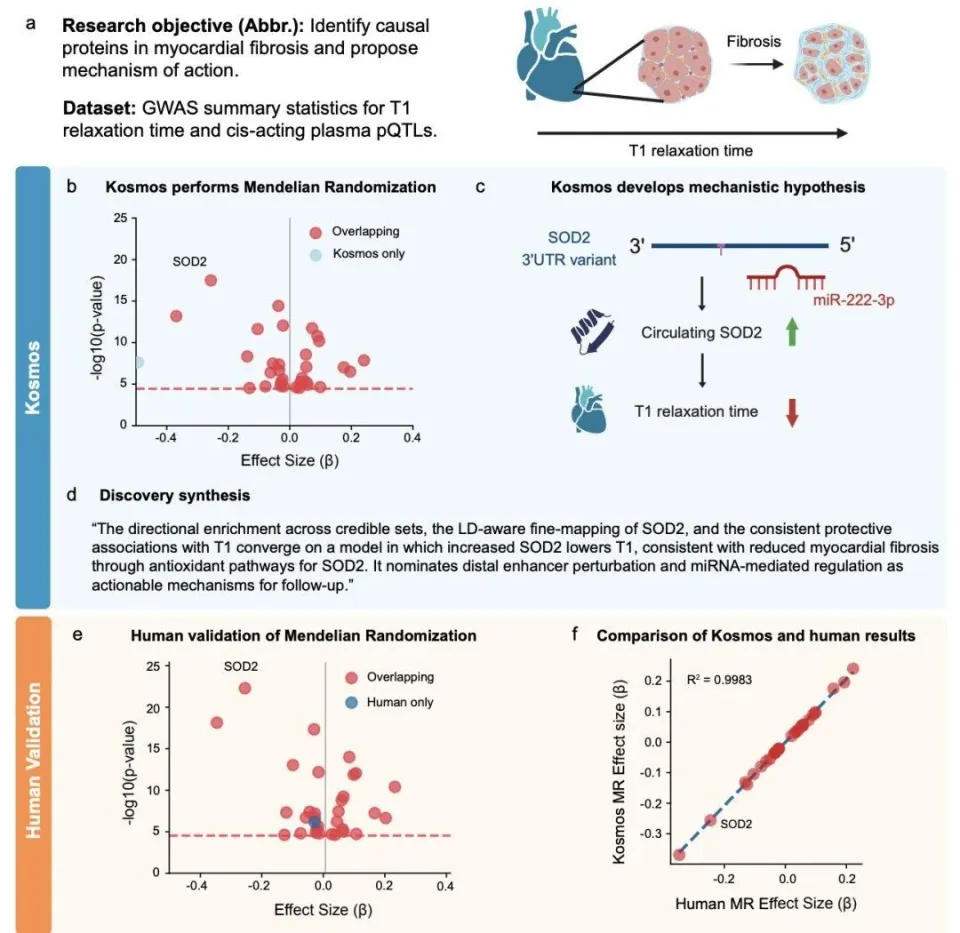 第四项发现:Kosmos结合公开的GWAS(全基因组关联分析)与pQTL(蛋白质数量性状位点)数据,进行孟德尔随机化分析,提供了统计学证据支持以下结论:血液中超氧化物歧化酶2(SOD2)浓度升高可能因果性地降低心肌 T1时间,并减少心肌纤维化风险。