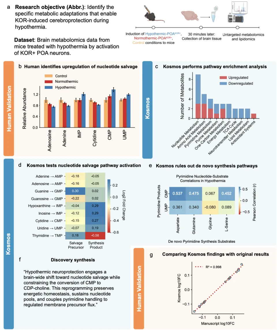 第一项发现:Kosmos利用代谢组学数据,复现了一篇尚未发表手稿中的核心结论——在低温条件下,小鼠大脑中核苷酸代谢是变化最显著的通路。