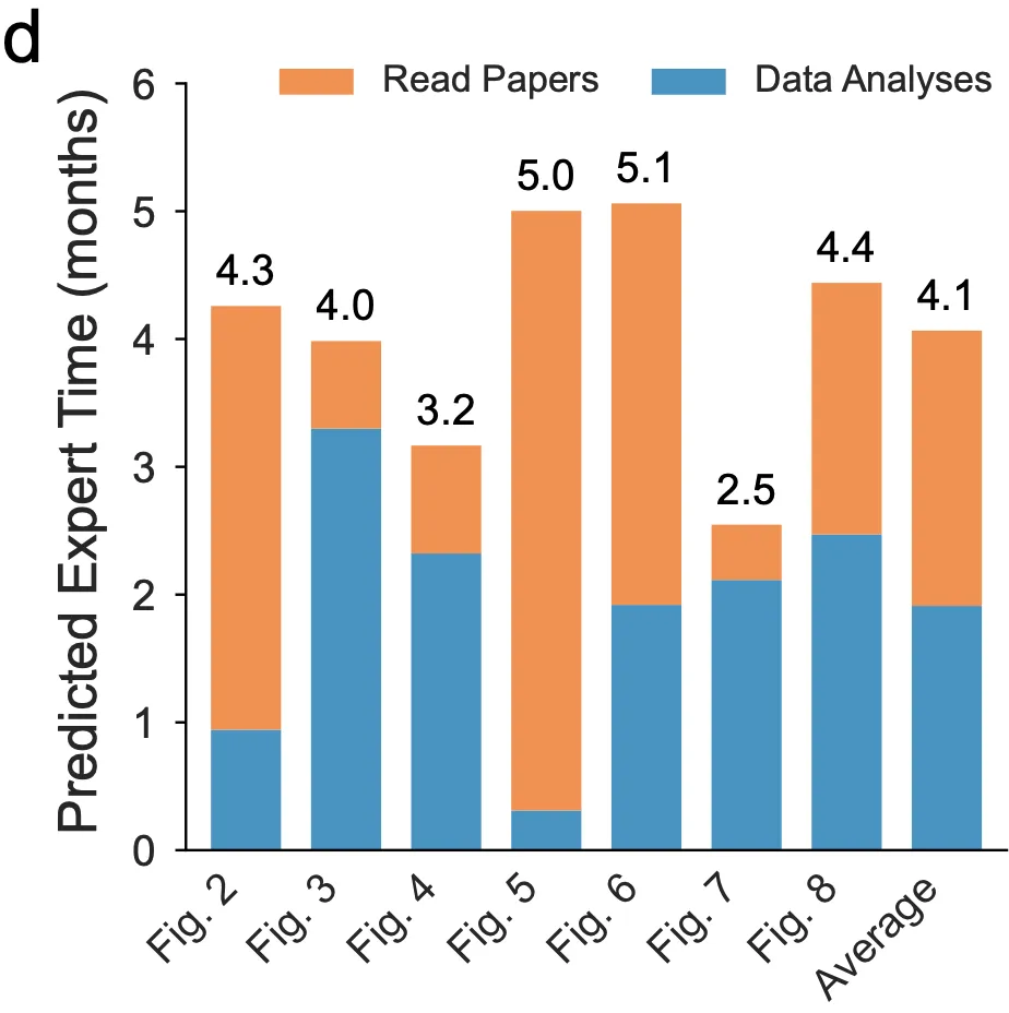 他们还构建了一个更为量化的评估模型:假设科学家平均阅读一篇论文需时15分钟,执行一次完整的数据分析路径约耗时2小时(该假设与METR对当前 AI 智能体在软件工程任务中的时长估算一致)。