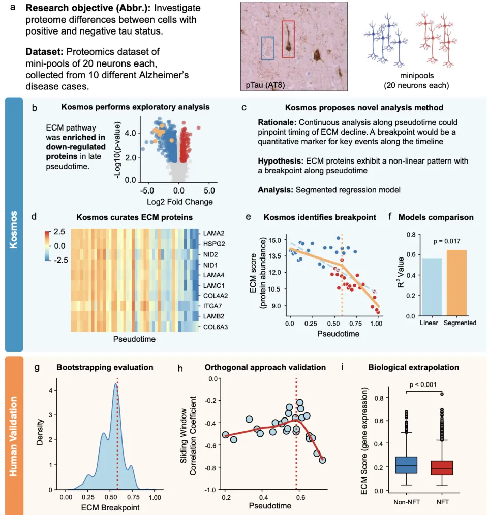 第六项发现:Kosmos创新性地设计了一种新型分析方法,利用阿尔茨海默病(AD)患者的蛋白质组数据,推演出导致神经元中Tau蛋白积聚的分子事件序列。