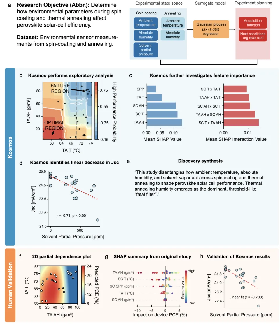 具体来说,Kosmos再现了这样一个结论:在热退火过程中,绝对湿度是决定钙钛矿太阳能电池效率的主导因素,并指出关键阈值为约60g/m³——一旦湿度超过这一值,器件将彻底失效。