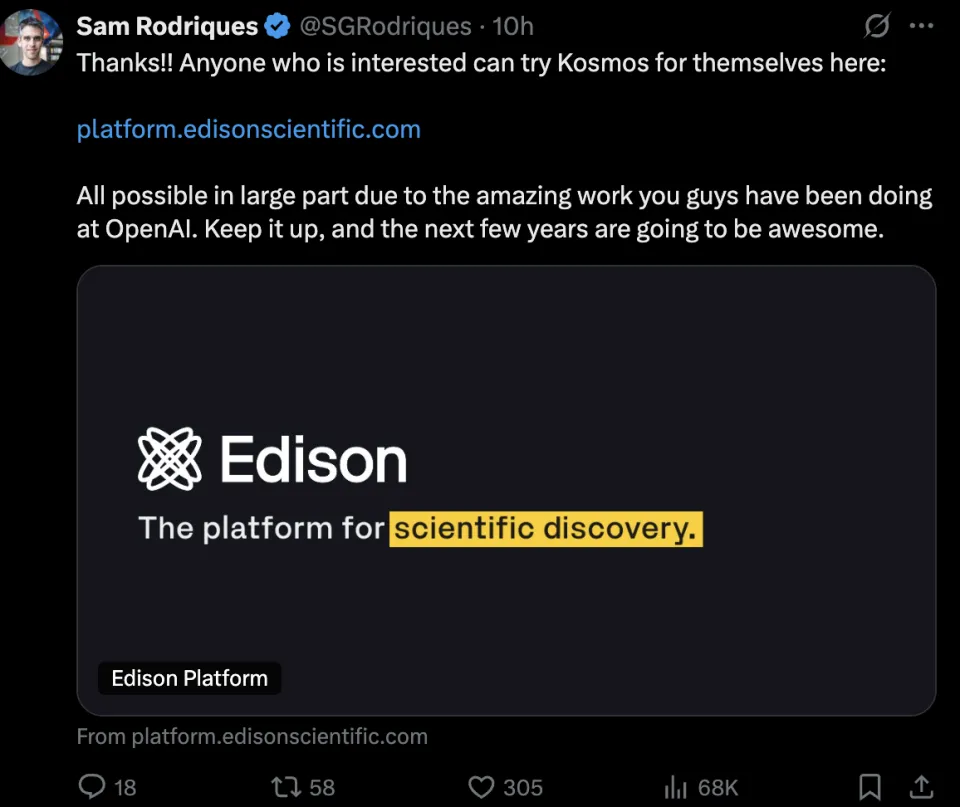 Edison团队强调,Kosmos并非闲聊式的「娱乐」工具,而是类似「试剂盒」的科研工具,适合用于真正高价值的研究任务。