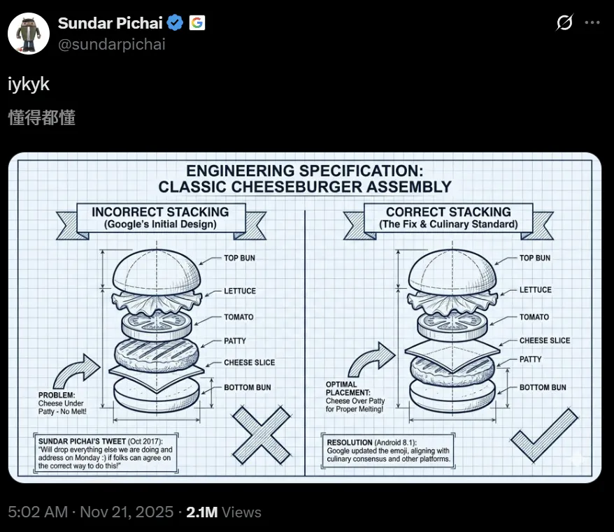 2017年,谷歌的汉堡emoji把奶酪放在肉饼下面,瞬间全网炸锅。这直接引发了一场又好笑又撕裂的互联网大战,大家疯狂争论「正确」的汉堡该怎么叠。