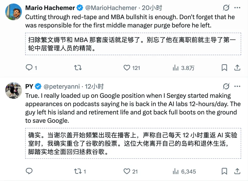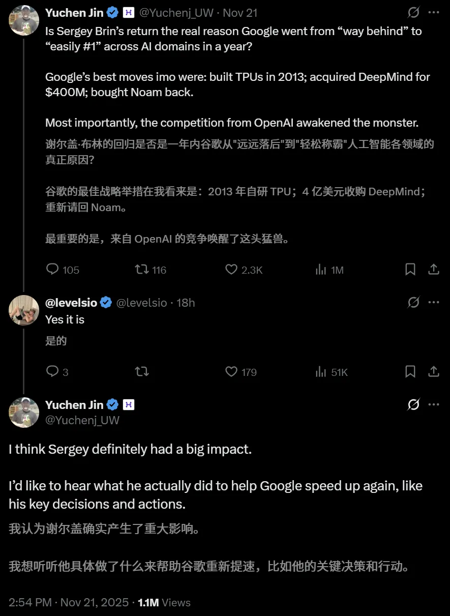 X的网友将布林的回归定义为:谷歌在一年内从「远远落后」到「轻松称霸」。