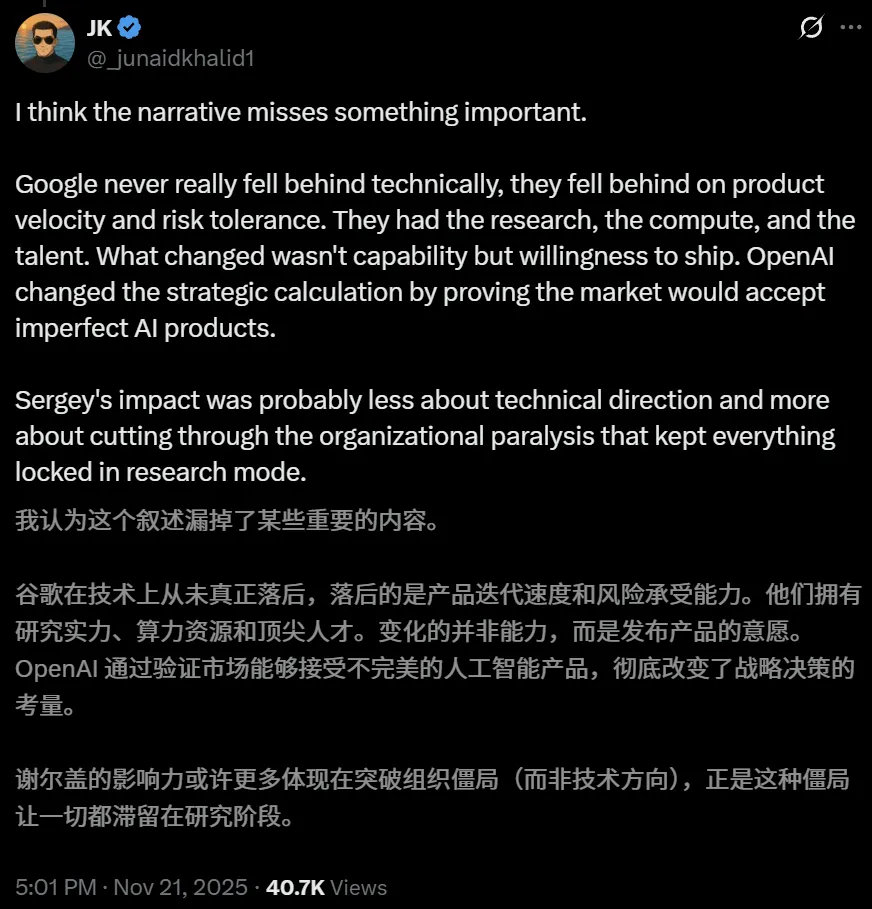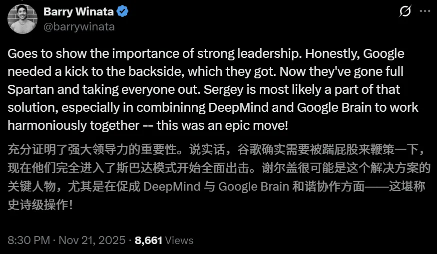 甚至有网友认为,如果不是创始人打通了谷歌部门之间的壁垒,Gemini 3或者Nano Banana Pro并不会以「全面出击」的方式上线。