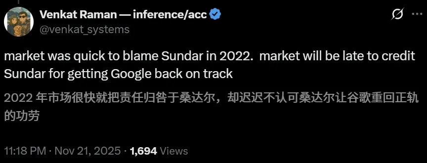 正如很多人在3年前将谷歌的落后归咎于劈柴,却不敢承认,正是劈柴让谷歌重回正轨,并完成对OpenAI的超越。