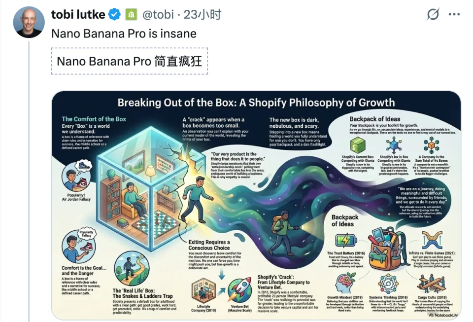 所有人都赞不绝口,很多大佬都成了自来水,比如Shopify的CEO直夸Nano Banana Pro简直疯狂!