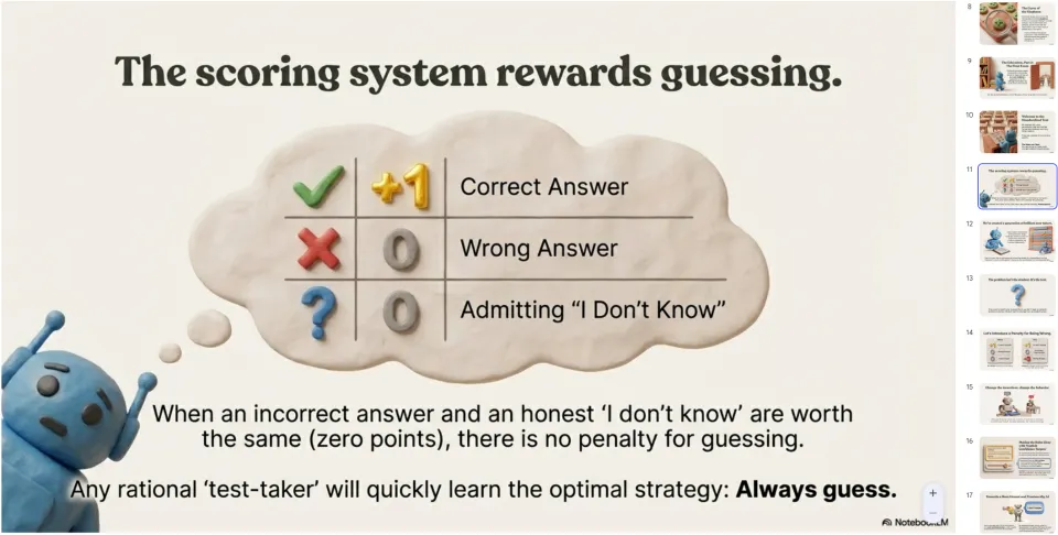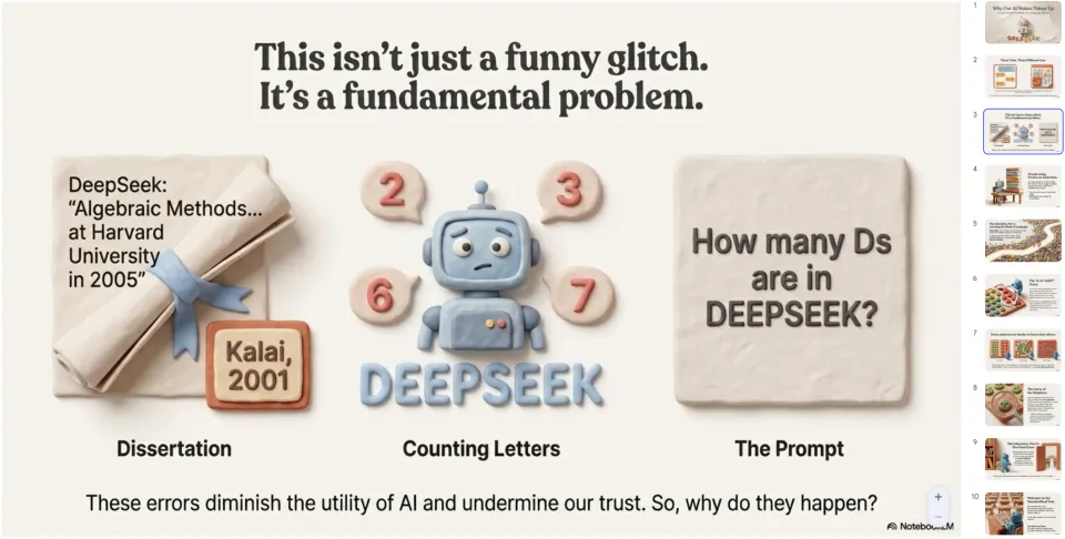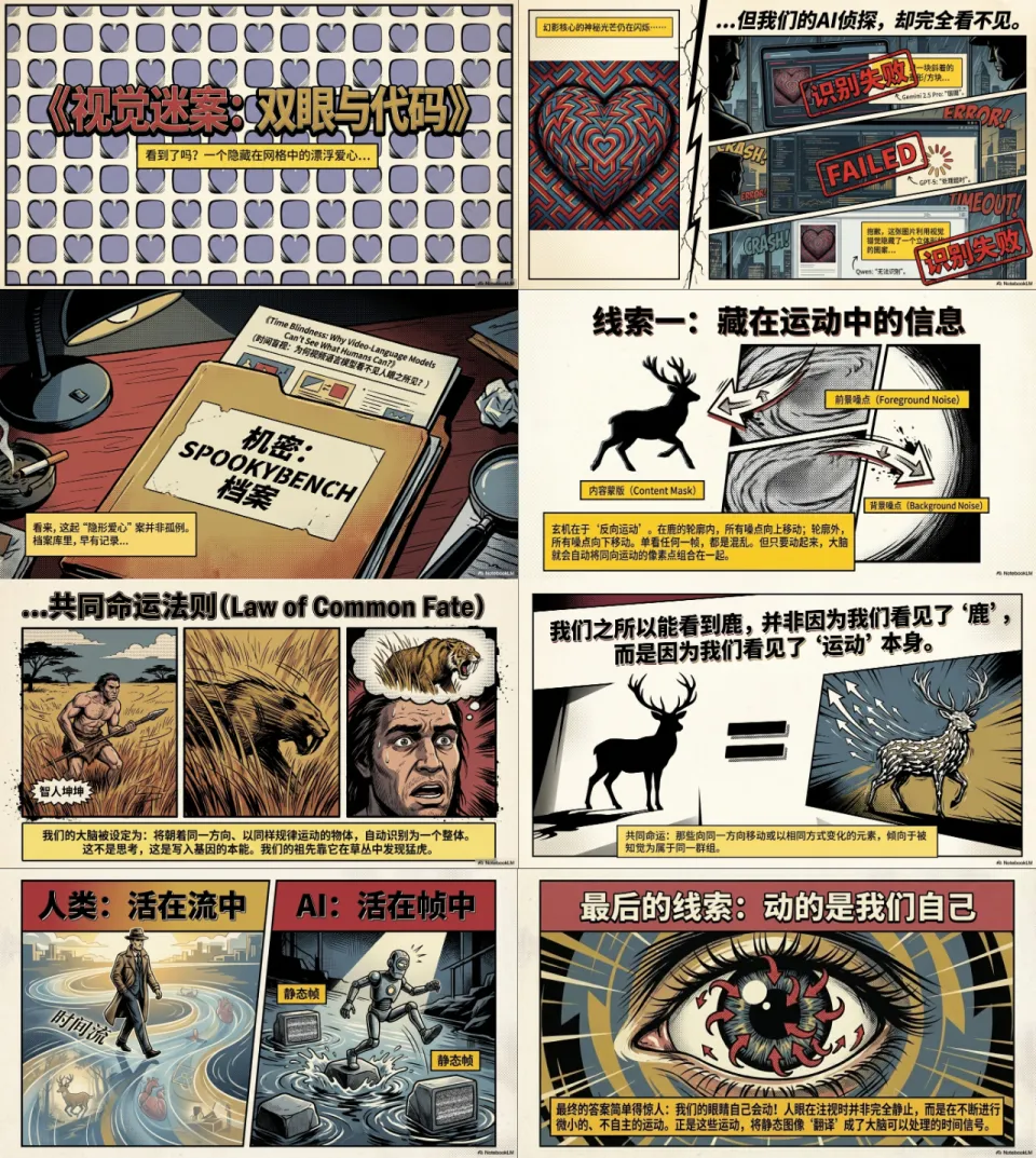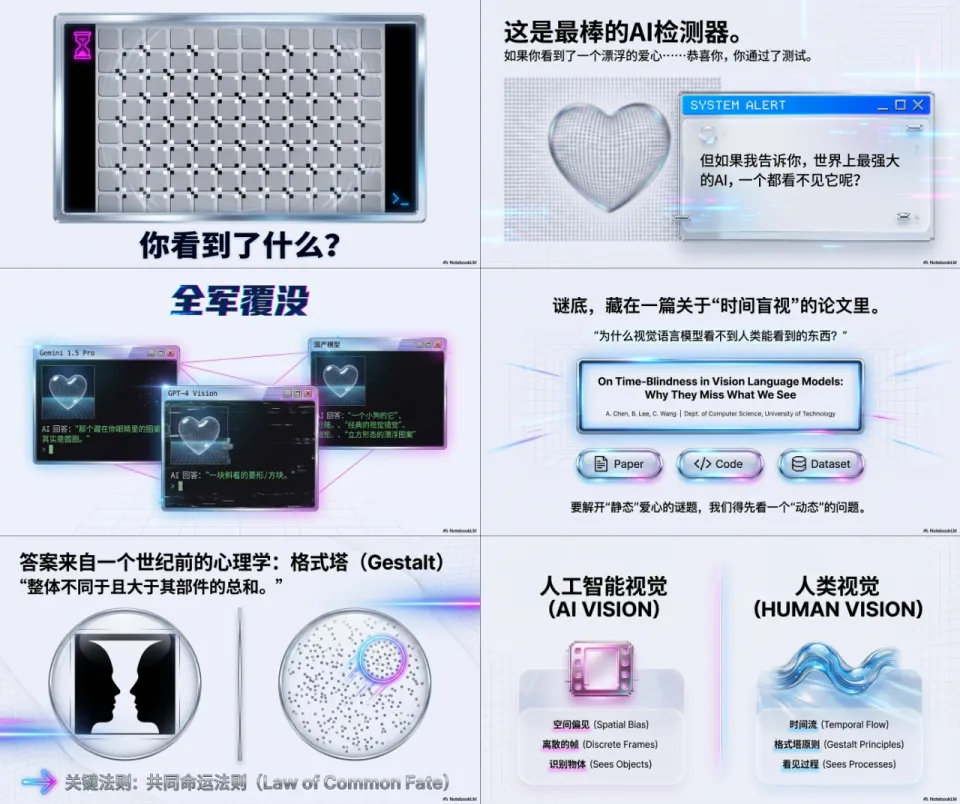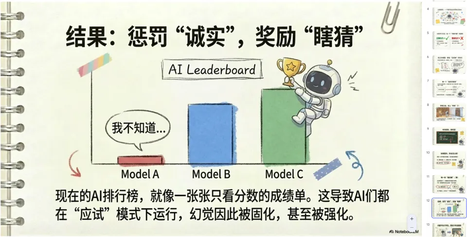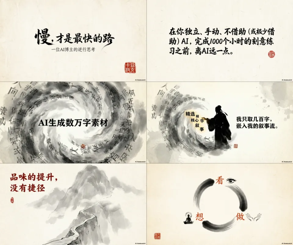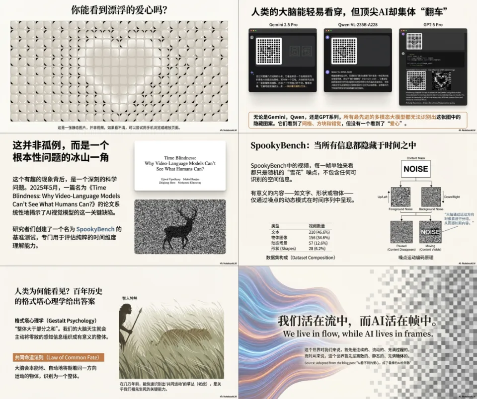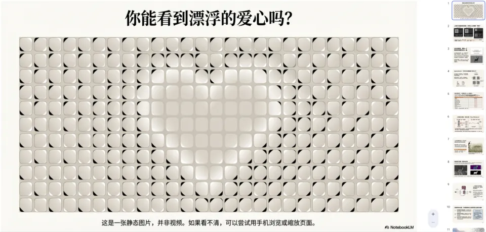 相信这几天,大家把Nano Banana Pro已经玩疯了。周五的凌晨,在通宵测试后,我也第一时间发了Nano Banana Pro的区别上一代的玩法合集。我想说,最让我惊喜的,其实,是NotebookLM支持Nano Banana Pro后,用它来一键生成PPT。比如,这是我把之前OpenAI的那篇论文《why-language-models-hallucinate》扔进去,用黏土拟物风格产出的英文PPT。真的超级粘土,视觉风格和配色,都极度讲究,也非常棒的遵循了排版原则。最牛逼的是,所有的数据,也都全部来自于论文原文,偶尔两页,错误会有一点点,但是很少了,完全处于稍微修改一下,就可以直接用的状态。比如这是同一篇论文,但是我说,要改成向小朋友进行科普的,文具手帐风。还有,把我之前写的那篇作为一个AI博主,我劝你先别急着用AI,变成漫画风格的PPT。我自己出去演讲的时候,经常就非常喜欢用大字报形式的PPT,无他,就是信息极度突出和显目,能最大化的配合我的演讲的节奏。而这一切的一切,都只是我把要转PPT的原始素材,扔了了NotebookLM,然后NotebookLM在拆解之后,调用Nano Banana Pro生成的。这里也简单的介绍一下,这玩意,是Google自己家出的知识管理产品,以笔记本(其实就是知识库)为核心,把你的知识可以整理在一个一个的笔记本里,然后进行提问、总结、各种模态的转化。之前NotebookLM其实火过好几波了,第一次爆,就是它开启了AI播客的这个赛道,从任意资料,生成两个人在对谈的AI播客。而现在,它已经成了一个全面的庞然大物,能把知识,进行各模态的流转。是我心中如今AI时代最好的AI原生知识管理产品,没有之一。网址在此:https://notebooklm.google.com/进去以后,新建一个笔记本,然后就会看到,让你上传数据。基本除了视频不行,啥格式都可以,PDF、wodr、txt、mp3、jpg等等。他们比较骚的一点就是,因为都是Google家的产品,所以也支持直接抓过来YouTube的视频。我就随手传了2个文件,一个是之前AI看不懂爱心的那篇论文《Time Blindness in Video-Language Models: The SpookyBench Challenge》,一个是我写的公众号文章AI看不到的爱心,成了最棒的AI检测器的原文。然后,因为NotebookLM支持DeepResearch,我就有顺带手的,让他给我总结了一份关于格式塔心理学的详细报告当做第三个文件扔了进去。这里我其实有点偷懒了,因为我说实话,Google家的DeepResearch的精准度真的一般般,对比OpenAI的DeepResearch其实真的挺拉的。因为我是格式塔心理学,其实没啥特别的难度,但是如果你对信息精准度的要求比较高,我的建议还是去ChatGPT使用DeepResearch去生成报告,然后下载一个PDF扔到NotebookLM里面来,别用NotebookLM自己的,你根本不知道在什么地方它就会坑你一道。在文件都上传上去以后,你就可以找到右上角的演示文稿。你如果懒得话,就可以直接点击这个卡片,什么也不管,NotebookLM在几分钟之后,就会给你生成一份默认预设的PPT。而且不同于很多其他的产品,你会发现,这里面的配图,都是我文章里或者论文里的配图,全都精准无比。其实从这个地方你也能看出来,这个功能本身,就是一个非常明显的工作流,而且背后用的就是Nano Banana Pro。内容进行总结和拆分,拆成PPT专用的格式以后,调用Nano Banana Pro一页一页的话,前面的图片为后面的图片的参考,以保证所有PPT的单页风格统一。当然,除了傻瓜式的默认直接点之外,你也可以点右边的笔,进入到设置界面。你可以输出两种PPT类型,一种就是详细演示文稿,这种东西,就不是你拿去演讲用的,一般上面的字巨多,就是纯粹的你拿去微信发给别人看的,当个材料。第二种就是演讲专用的,演讲专用的就是我上面那种,一页上可能只有一两句金句和部分信息,发布会上的PPT基本就是演讲PPT。这个地方的Prompt其实也不需要多复杂,主要就是三个点:即你这个PPT,希望用什么风格展示给谁看,有没有需要重点展示的内容。“使用黑色背景酸性设计风格,来从为什么看不到图中的爱心开始,为大家详细科普人类和AI视觉的不同,观众是一些对AI感兴趣的爱好者。”