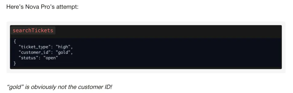 比如Nova Pro调用了searchCustomers工具,但是在customer_id(客户ID)这个参数里,它填入的值是“gold”。