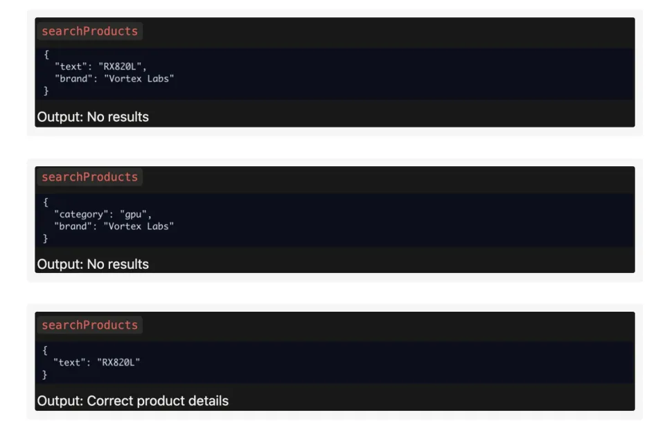 而Gemini 2.5 和 Qwen3 完美地执行了前两步。但在第三步,它们搜索brand="Vortex Labs"(带空格)时,系统返回了一个空结果。因为在数据库里,这个品牌被存为“VortexLabs”(不带空格)。