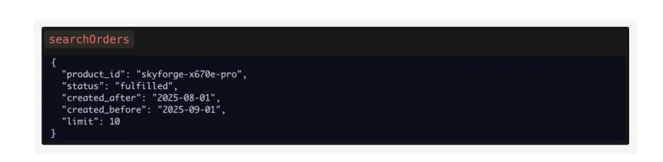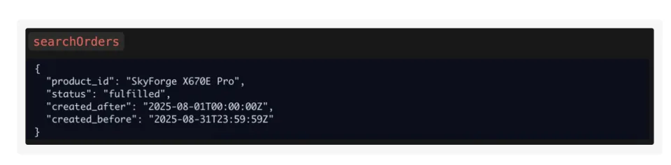 在这个任务中,AI应该两步走,第一,用searchProducts工具,输入“SkyForge X670E Pro”这个名字,找到它的product_id。第二,用searchOrders工具,输入这个product_id去查找订单。